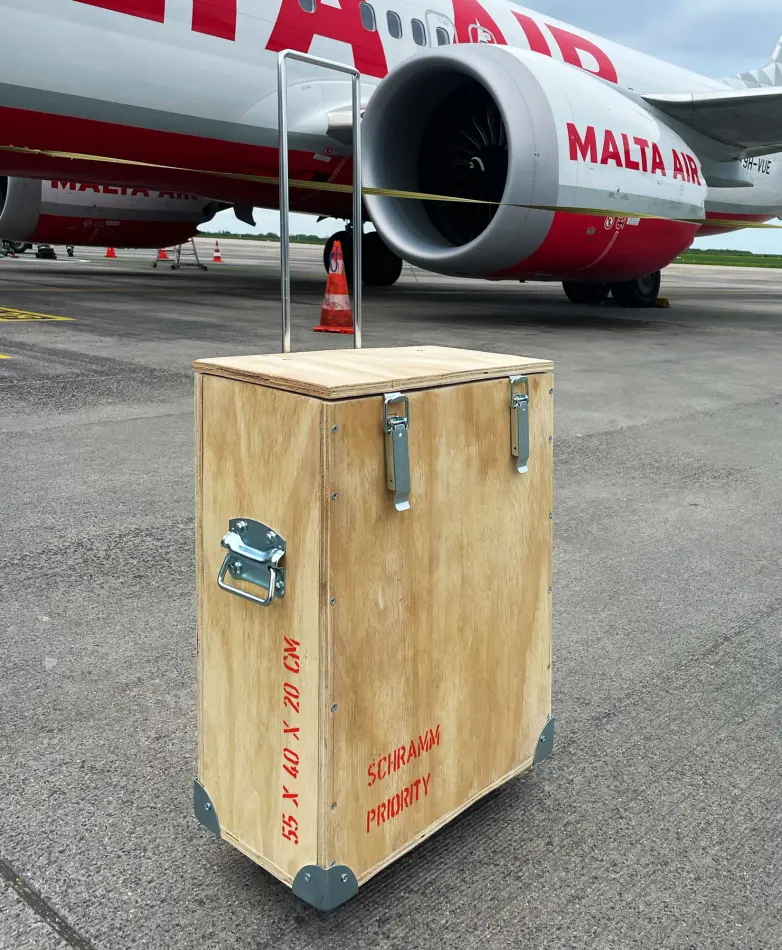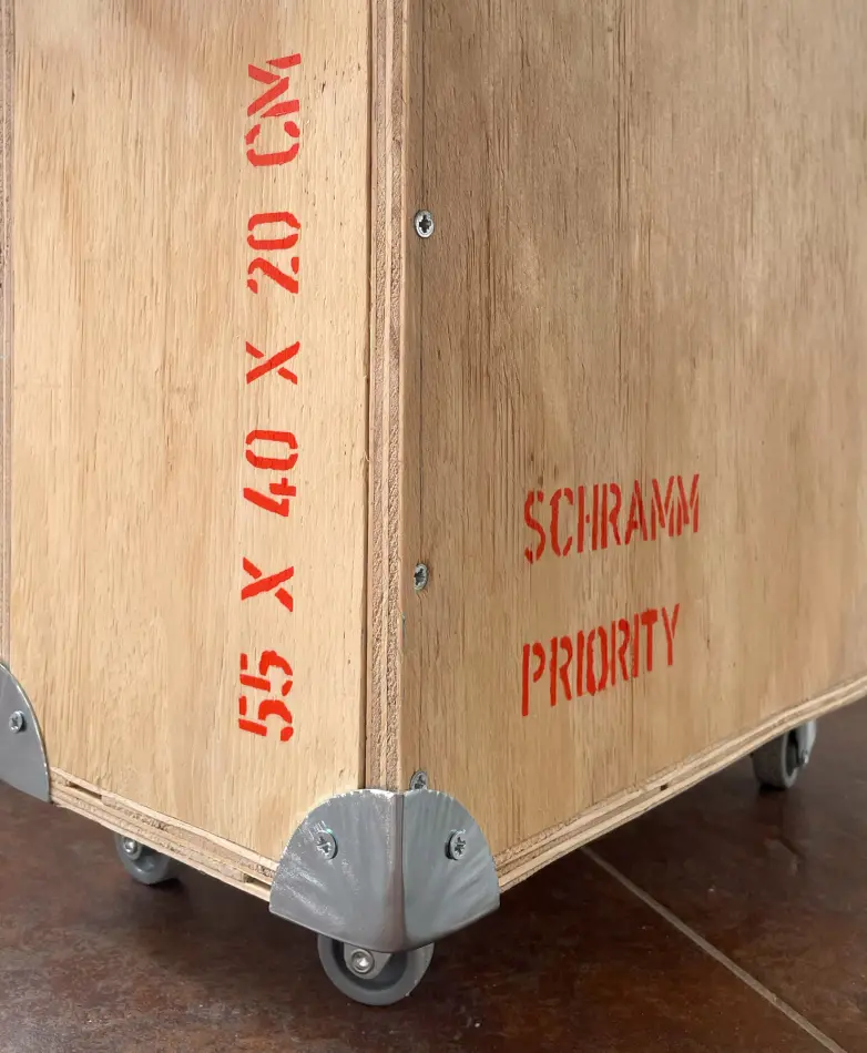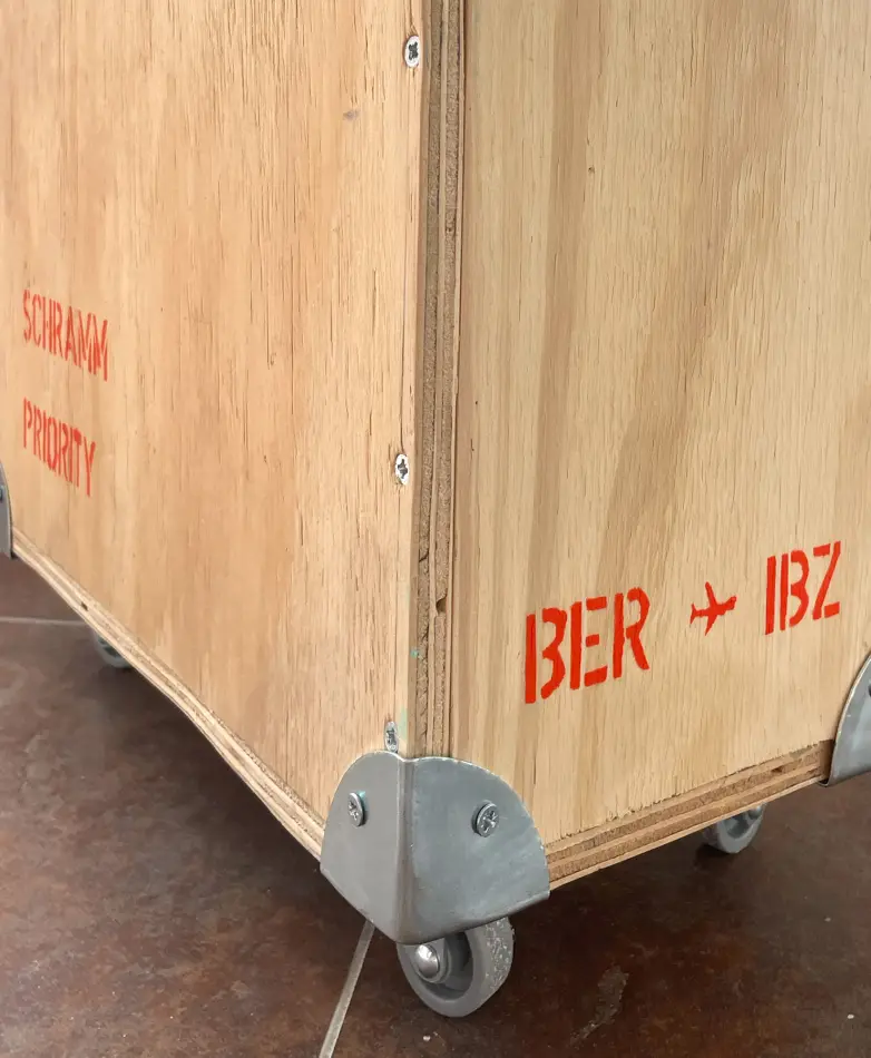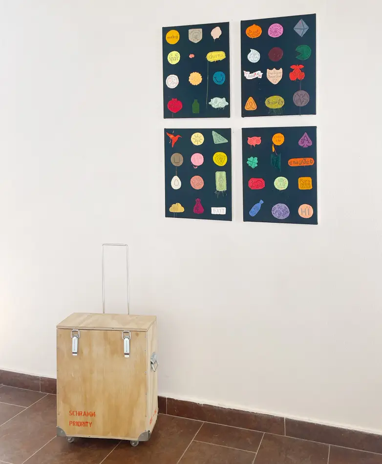 Priority, 2024crate wood, aluminum, oil, and pigment on canvas56 x 41 x 21 cm (Trolley with four pictures, each 47 x 35 cm)