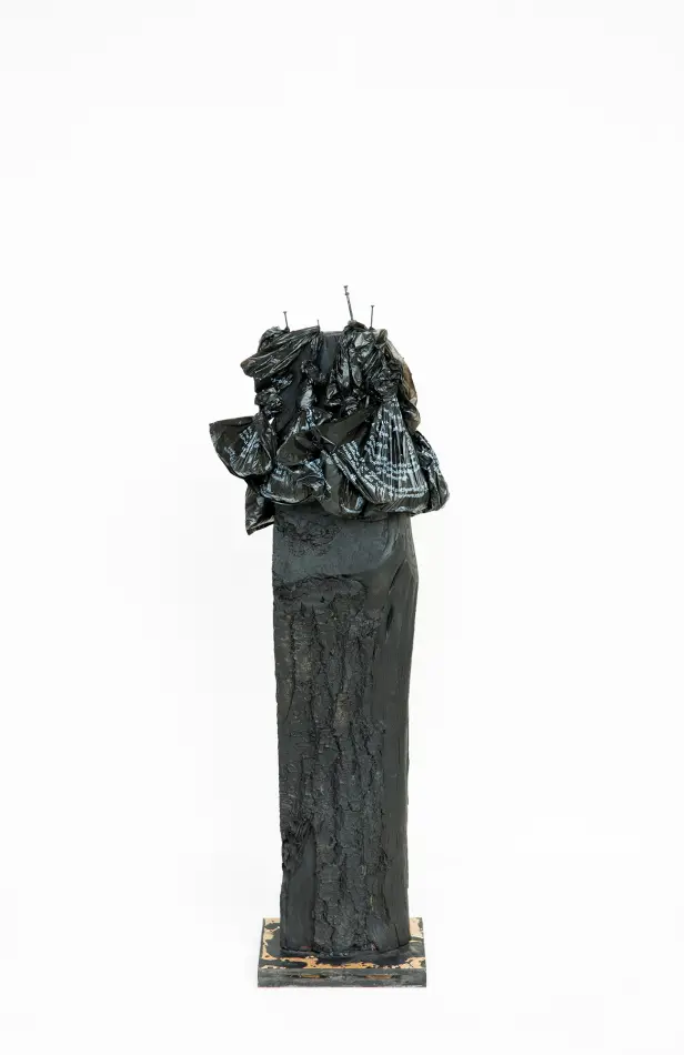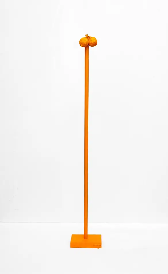 Deténte Absolue, 2019wooden sacks, iron, and spray paint108 x 30 x 30 cm