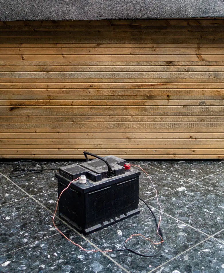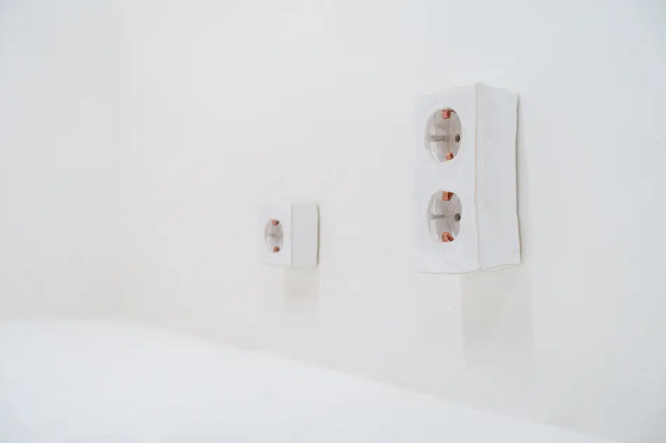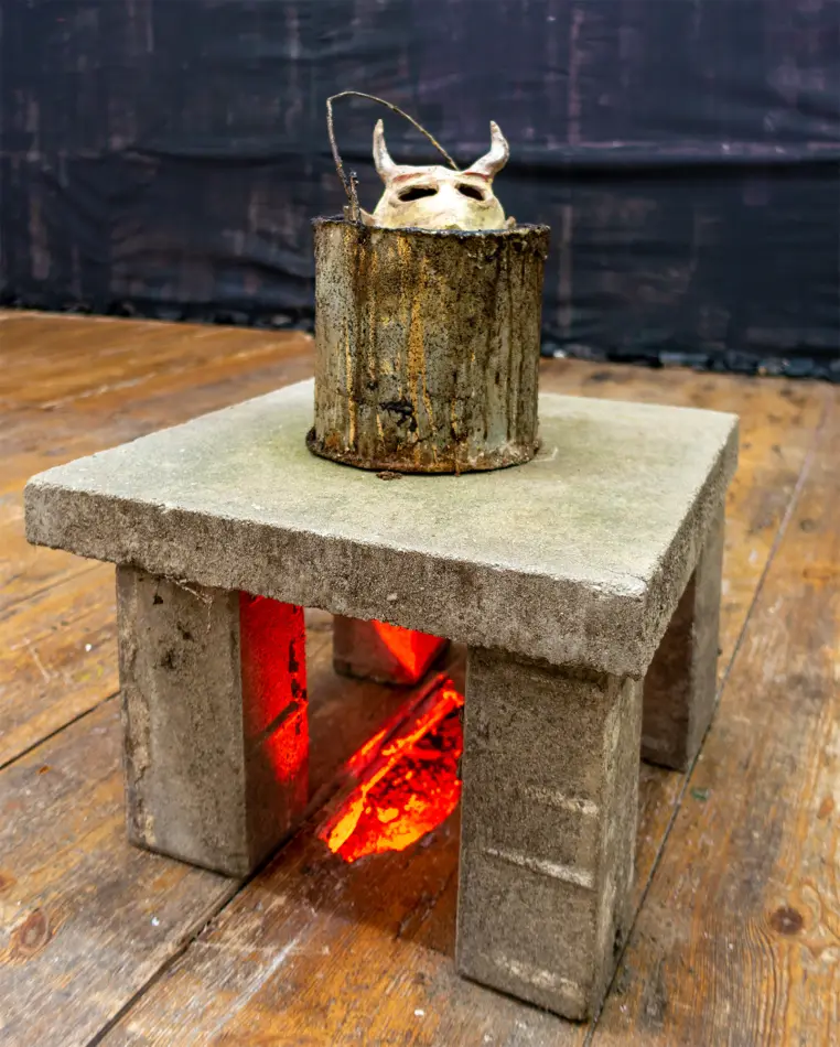 Pech, 2022cement bricks, tar bucket, light bulb, electricity, and glazed ceramics50 x 40 x 40 cm