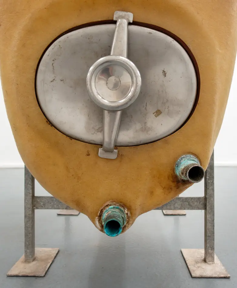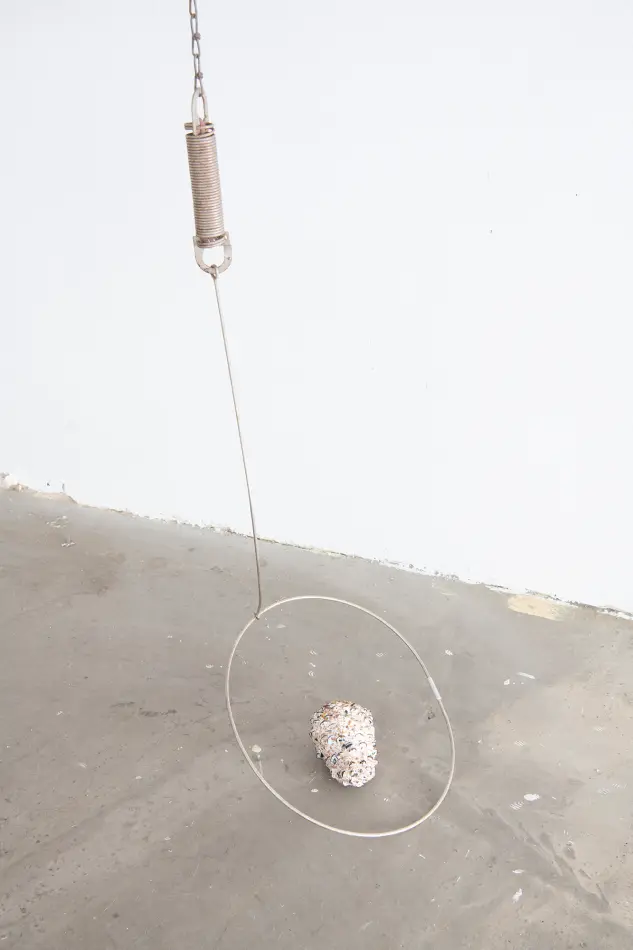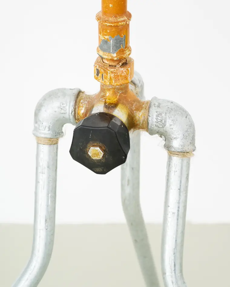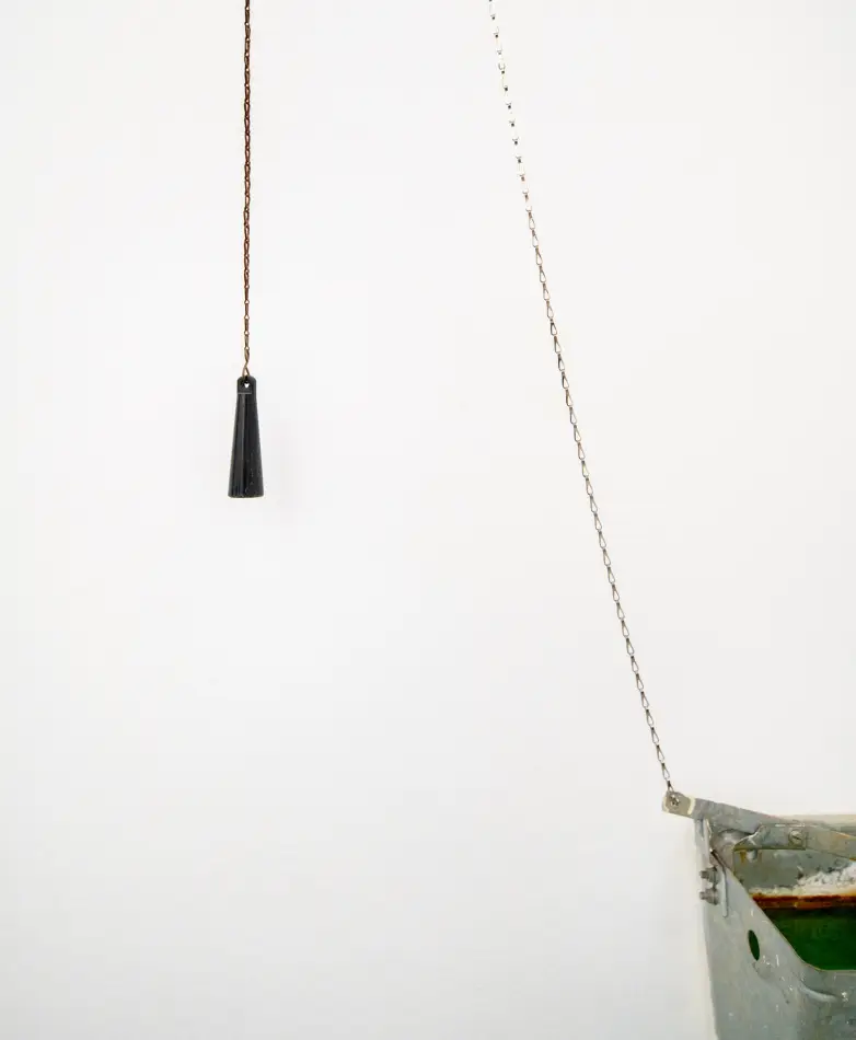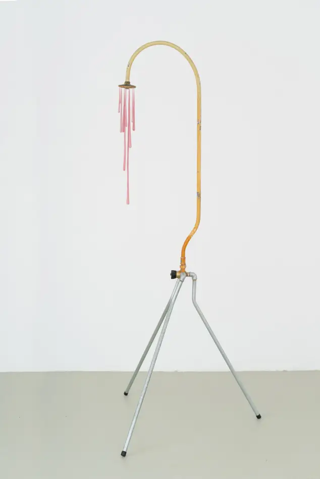 Untitled (Große Dusche), 2025found object, galvanized malleable iron, hemp, synthetic resin & pigments210 x 105 x 75 cm