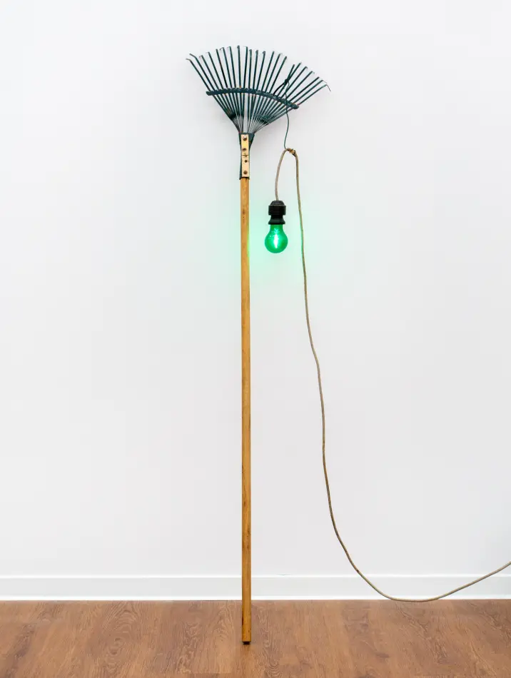 Lichtfalle Grün, 2021rake and light bulb152 x 36 x 15 cm