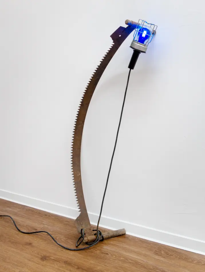 Lichtfalle Blau, 2021tree saw, construction lampdimensions variable