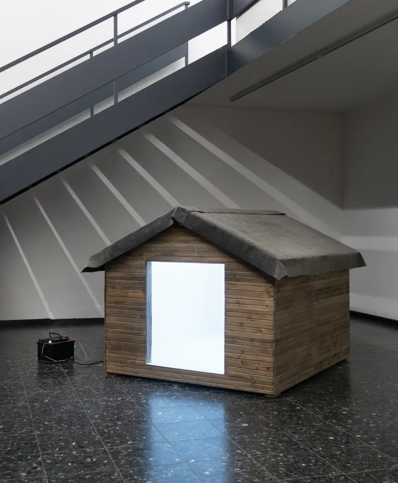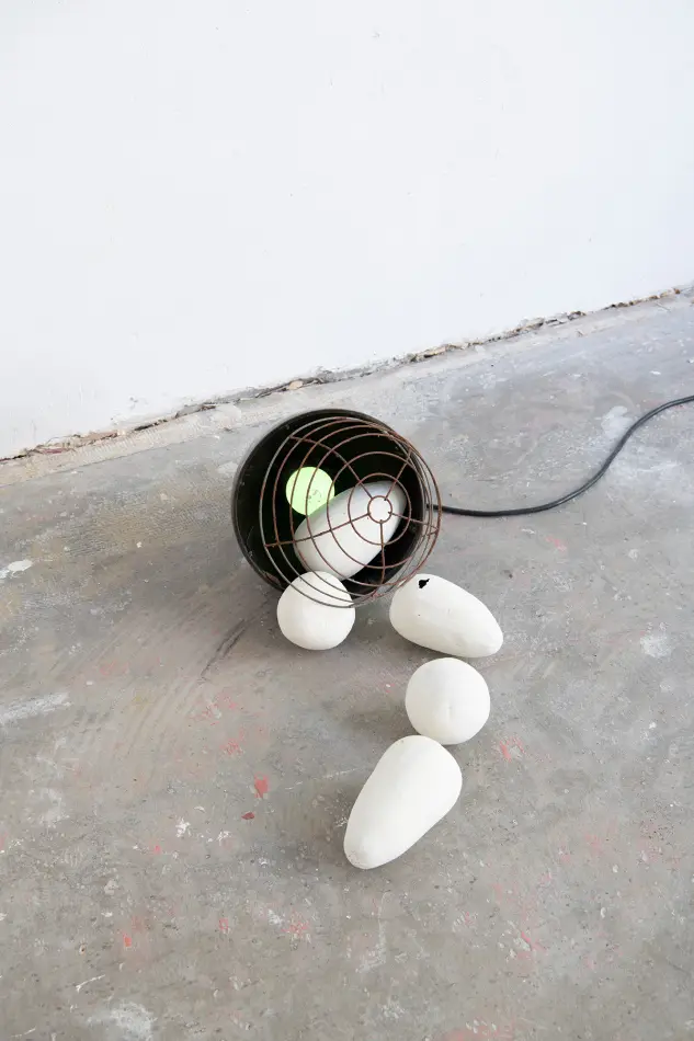 Langsamer Brüter, 2021wood, metal, plastic, electricity, red light bulb, and quail eggsdimensions variable
