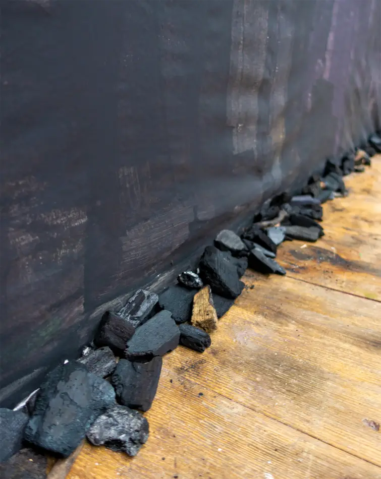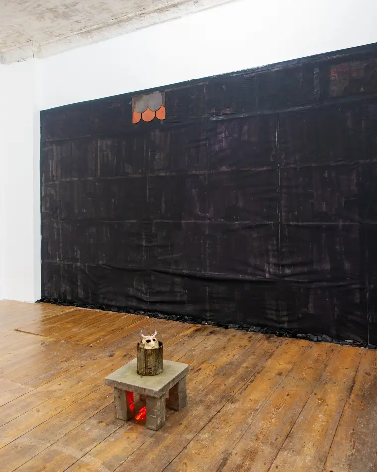 Untitled, 2019wool blanket, coal, wood, and fat balls86 x 44 x 40 cm