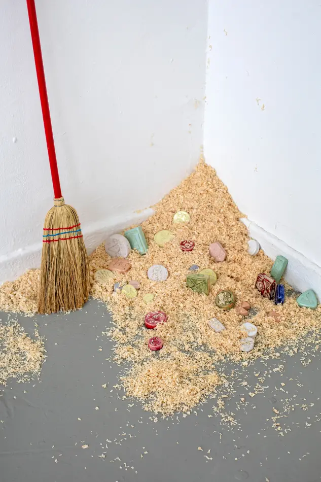 Schwemme, 2021glazed ceramics, sawdust, children's broomdimensions variable